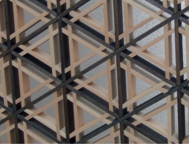組子は「地組」と「葉組子」を組み合わせて作ります。その組み合わせによりできるデザインパターンは数百以上にもなります。