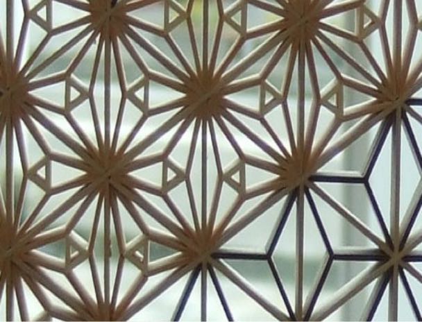 麻の葉の組子を三方から入れた模様で、外側の組子と中央の麻の葉からできており、葉が二重になっています。